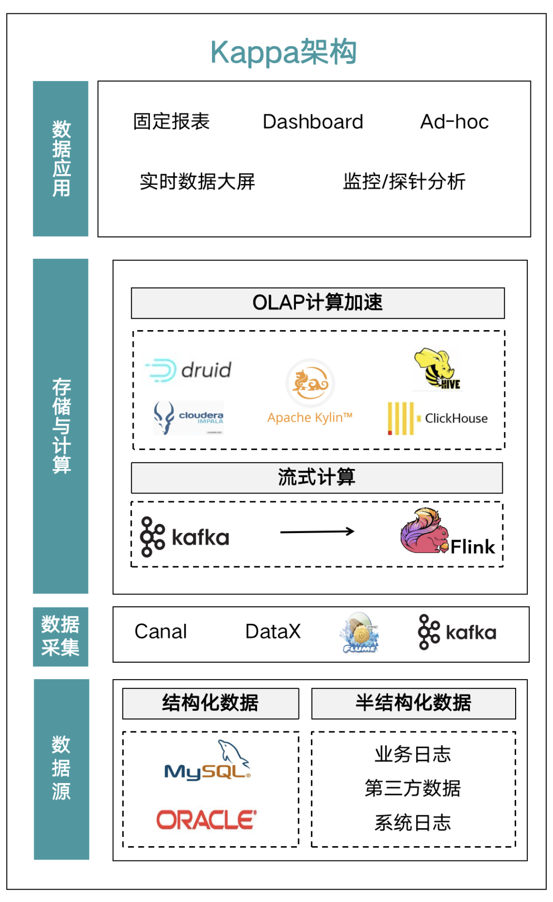 后来就衍生出了 Kappa 架构。Kappa 架构通过改进流式计算架构和计算和存储处理过程,使实时计算和批处理能够共用一套代码,解决了 Lambda 架构中“流批分离”的复杂处理链路和维护两套代码的问题,从而实现了我们通常所说的“流批一体”。但是 Kappa 架构也存在一定缺点,无法支持海量数据存储,也无法支持高效的 OLAP 查询。