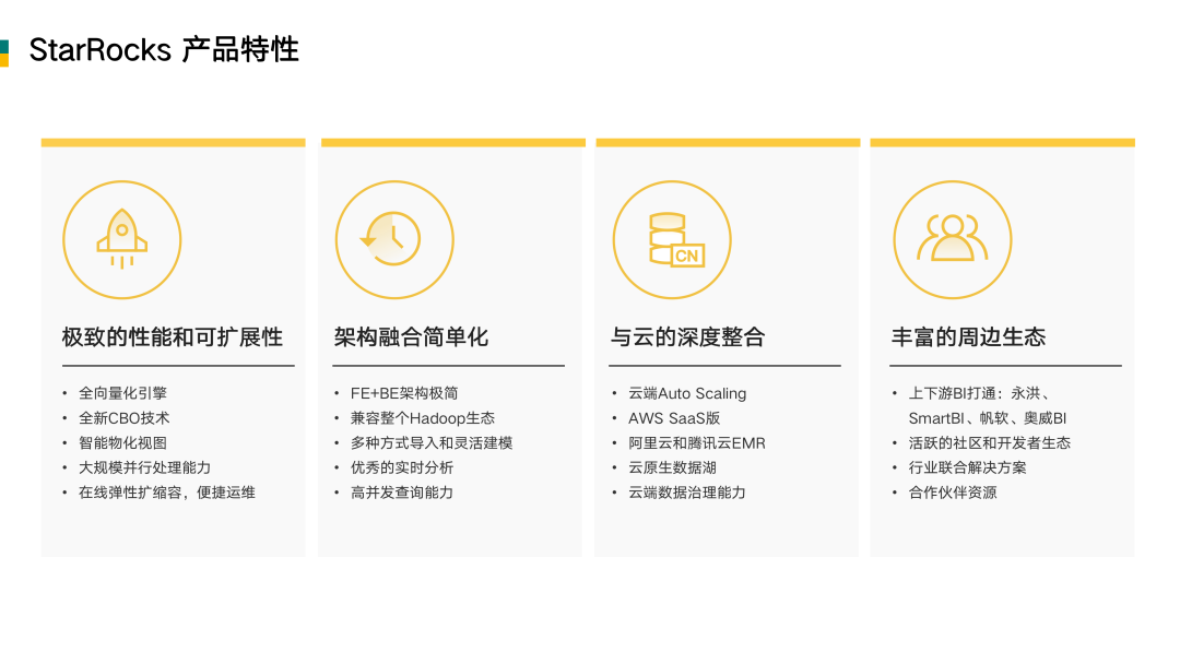 总体来看,StarRocks 产品具有极致的性能、可扩展性、架构融合简单运维容易、云的高度融合、以及丰富的周边生态,这些都是过去两年不断在行业场景下打磨的成果。这些特点也是被用户所肯定和采纳的。