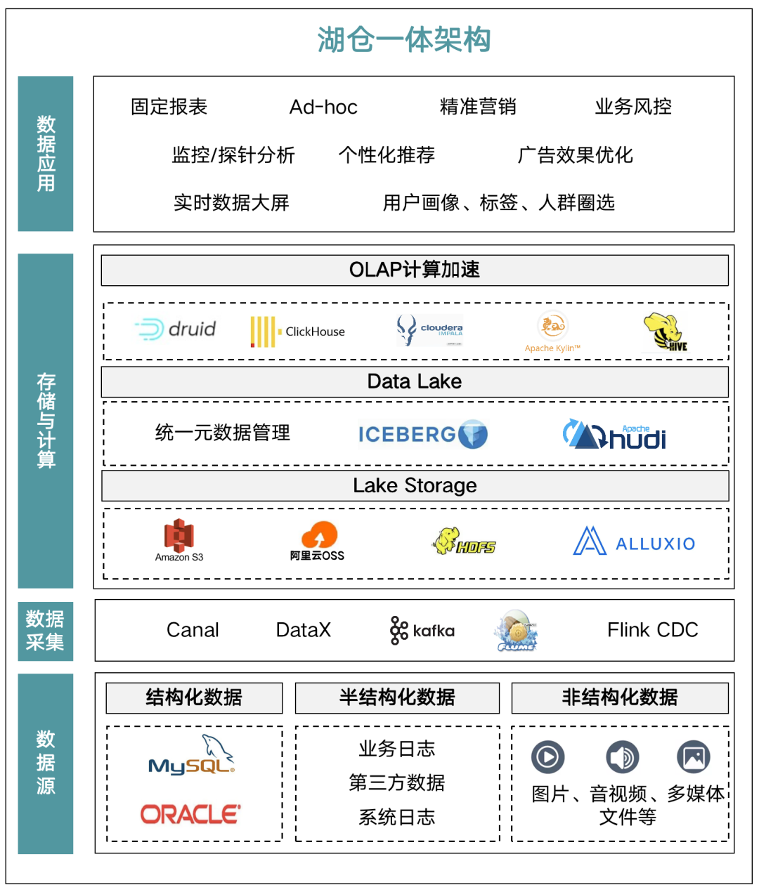 一是全面的数据摄入能力。既可以通过 DataX、Kettle、Canal 等工具支持,摄入传统的TP 类的业务数据,也可以通过 Flink Connector、Spark Connector 将流式数据导入,而对日志、图片、音视频等非结构化数据可将数据写入到湖中。