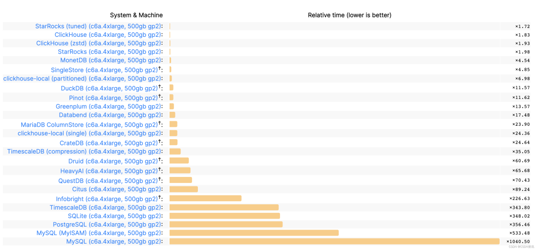 ClickBench 以可重复性、兼容性、多样性、真实性为目标,基于全球最大的网络分析平台去选取数据来源,涵盖的数据类型非常多样,所有上榜的结果都可以复现,能够真实反映各大数据厂商在生产环境的性能。默认情况下,各个数据库项目提交的版本都会按照业界最为通行的 c6a.4xlarge, 500gb gp2的机型来进行测试。最终, StarRocks 在通用规模下获得了单表查询性能第一的成绩,首次取代 ClickHouse 登顶该榜。