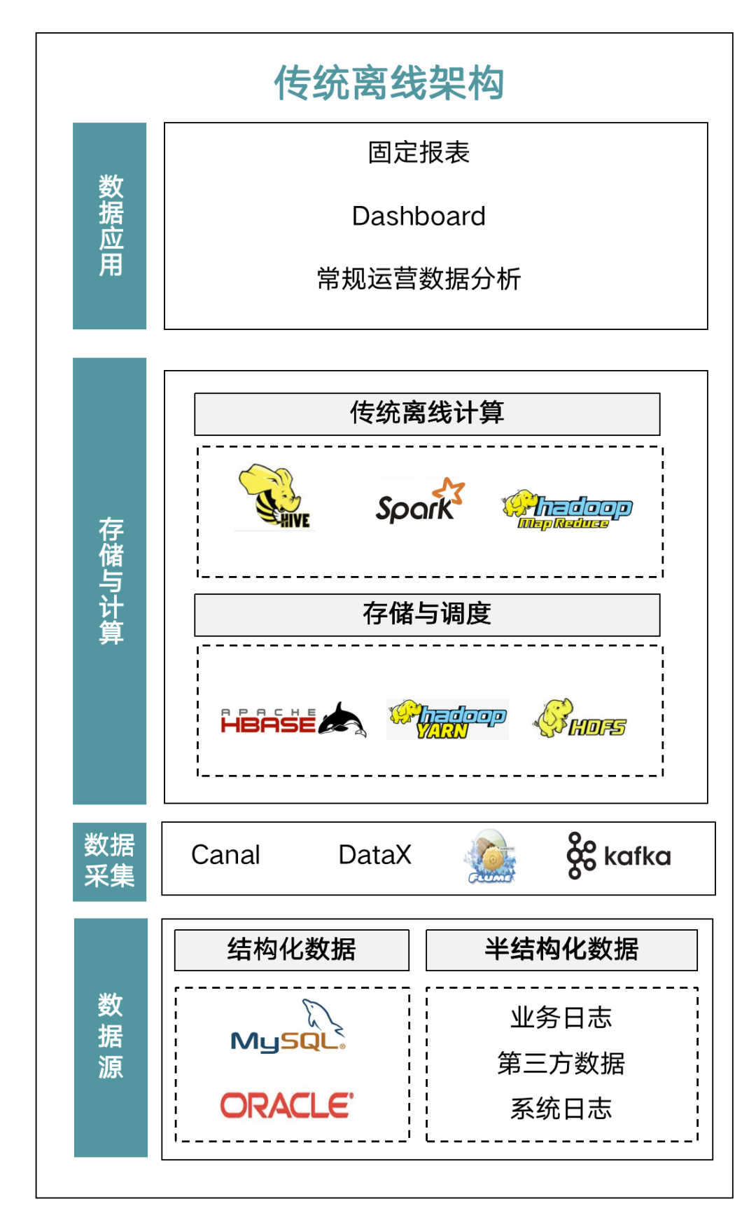 第一个阶段,就是传统的离线架构。第一代是以 Apache Hive(以下简称 Hive)、MapReduce、HDFS 为代表的纯离线数仓。这个阶段下,很多公司刚开始搭自己的大数据技术,数据体量和数据规模都不是特别大,通常在 TB 级,维度也不是很多。业务团队的需求通常是 T+1 型的固定报表任务,它的架构痛点非常明显,就是离线大数据架构不能处理实时业务,固定报表反馈出的数据价值是很低的。