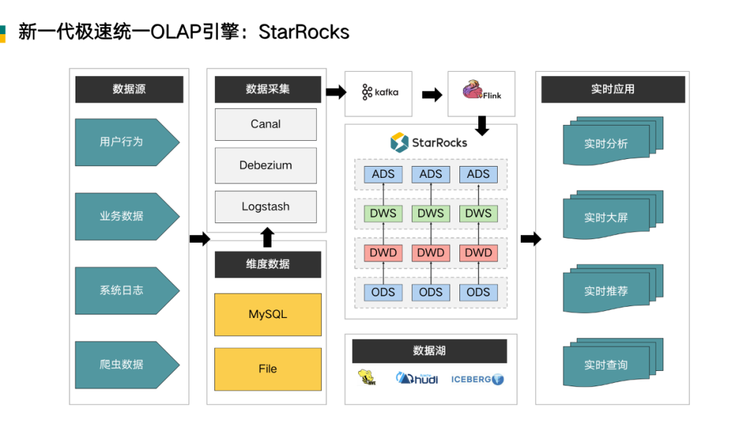 所以基于此前很多企业的 Kappa+Apache Flink(以下简称 Flink) 的实时数仓架构之上,结合了 Apache Druid(以下简称 Druid)、ClickHouse 等 OLAP 引擎做混合架构,使用 Apache Iceberg(以下简称 Iceberg) 或 Apache Hudi(以下简称 Hudi)构建 Lakehouse ,即现在常见的湖仓一体架构。但带来的一个问题就是随业务线复杂化,同时需要维护多套 AP 组件,运维成本非常高。