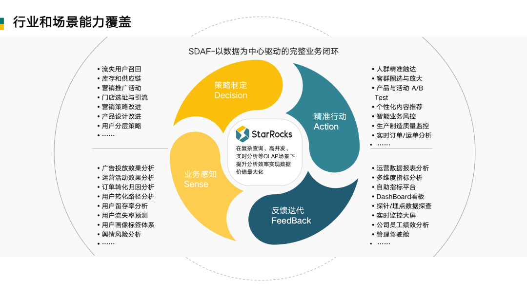 我们以怎样的视角来面向行业并提出解决方案呢?上图是最近几年神策提出的比较经典的数据分析 SDAF 方法论,我们可以用来阐述以数据为中心来驱动业务发展的场景覆盖能力。分成四个阶段:
