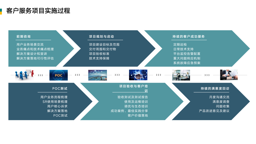 从前期咨询,到 POC 测试,到项目规划与启动,到项目验收与客户培训,到持续的客户成功服务,到持续的满意度回访,再回过头来,去找新的业务来去做前期咨询……不断重复这个过程。