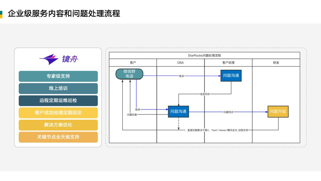 企业级服务离不开标准的人员能力和规范的服务流程。镜舟科技在与 StarRocks 产品很好结合的基础上,在为用户提供服务的过程中不断优化和迭代,形成除产品力之外的另外一个驱动轮子,我们叫“双轮驱动”。