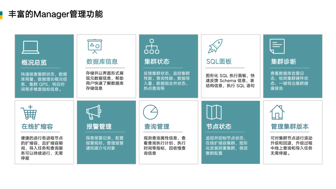丰富的 Manager 管理功能: 这是镜舟目前提供的最重要的服务,Manager 能够提供的功能包括:通过“概况总览”来去快速探查集群状态,了解“数据库的信息”,查看“集群状态”,提供“SQL 面板”去对 SQL 进行执行。另外还包括做一些简单的优化,做集群诊断,在线扩缩容,提供报警管理、查询管理功能,也可以非常方便地去查看节点状态,管理集群版本等等。