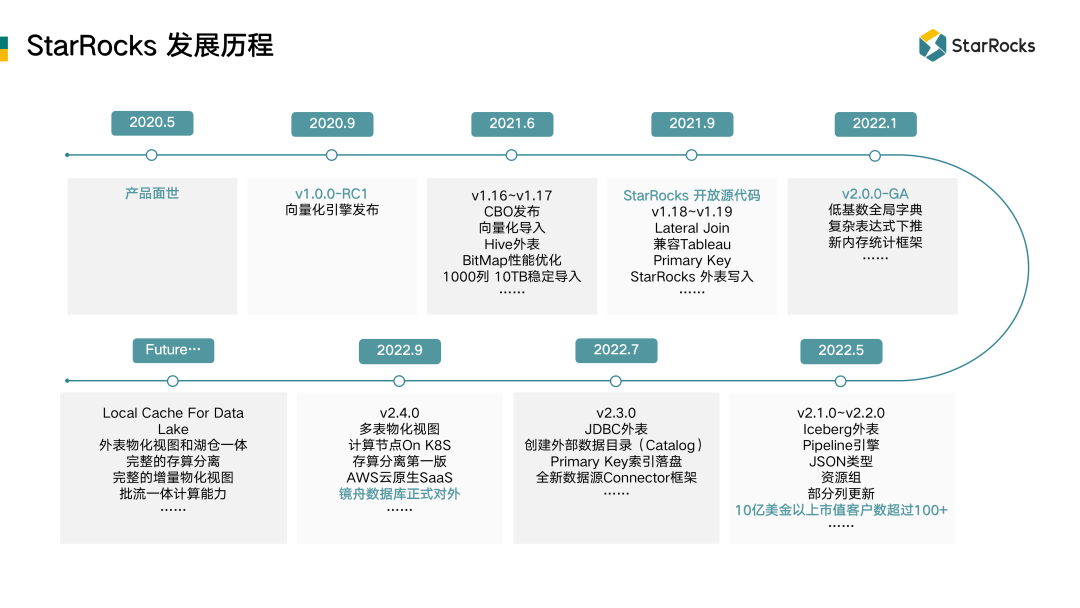 从 2020 年 5 月产品面世,到 2020 年 9 月 V1.0 正式发布。之后的一年,StarRocks 不断完善技术和产品,在 2021 年 9 月份开放源代码,之后不到 4 个月升级到 V2.0。2022 年 5 月,10 亿美金级以上的企业已经达到了 100 家。在此期间,产品又经历了多个迭代和升级,产品的功能和性能稳定性以及生态能力都有大幅度的提升。
