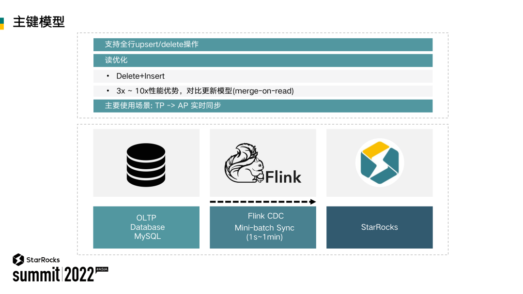 虽然仅支持整行的 upsert 和 delete,但它非常适合 TP 到 AP 实时同步数据并加速查询的场景。一般通过 Apache Flink(以下简称 Flink) CDC 工具将 TP 业务系统,比如 MySQL 的数据直接同步到 StarRocks 系统中加速查询,极大地简化实时分析的数据流。它非常简单易用,目前已有很多个用户在线上系统中采用,是目前实时数据分析的典型范式。
