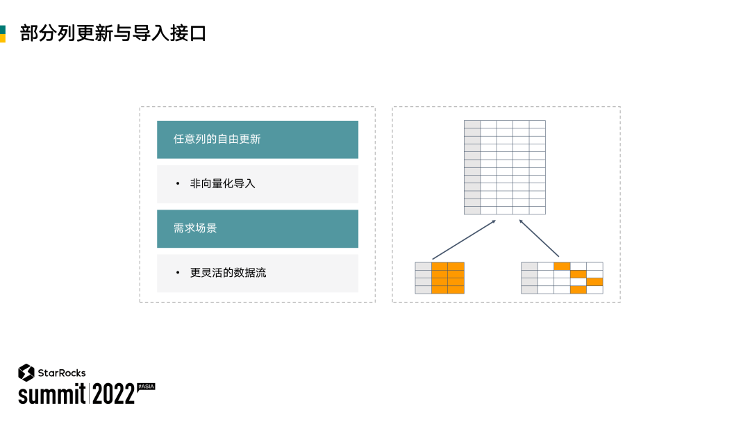 目前部分列更新只支持固定列的更新,同一个导入事务中所有行的更新的列必须完全的一致,这就对上游数据造成了很大的一个限制。因为很多应用场景并不是简单的一个多表交应,比如说图中表达的两种这个部分列更新的一个模式。左边是完全静态的部分列更新的支持方式,目前我们是支持的。但是右边的这种任意列更新的方式目前还是不支持的。原因是目前整个导入数据流程都是以向量化的方式去实现的,向量化要求数据是整齐的列存储的方式的表达。那如果强行使用列存的方式组织任意列更新的导入,就会有很多额外的开销,并不高效。