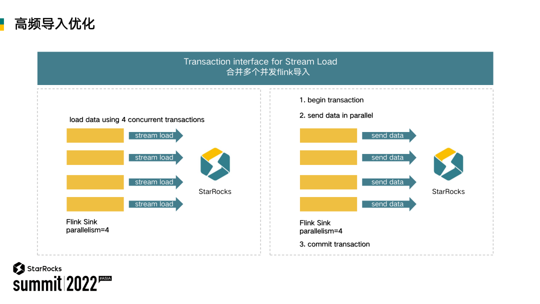 针对 Flink CDC 同步任务并发导致的事务数量成倍增加的问题,我们新增加了基于 streamload 的事务导入接口。原来每个 Flink Sink 的 task 会单独对应一个导入事务,导致事务数量成倍增加。使用新的事务接口之后,可以将多个导入任务合并成一个事务。在定期 Sink 开始前,开启这个事务,然后并行导入写入数据,最后全部 task 完成数据的传输后,整体再提交这个事务。在上面这个例子中,总事务数就可以从 4 个减少到 1 个。高频导入的问题,本质上是事务数量多的问题,通过降低事务数量,可以避免高频导入带来的一系列问题。