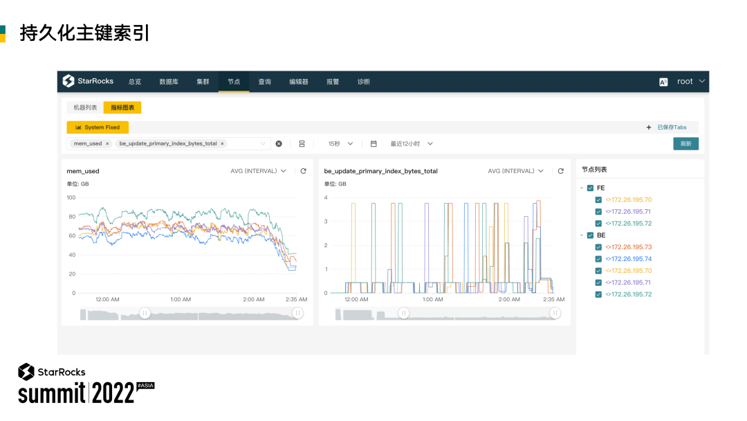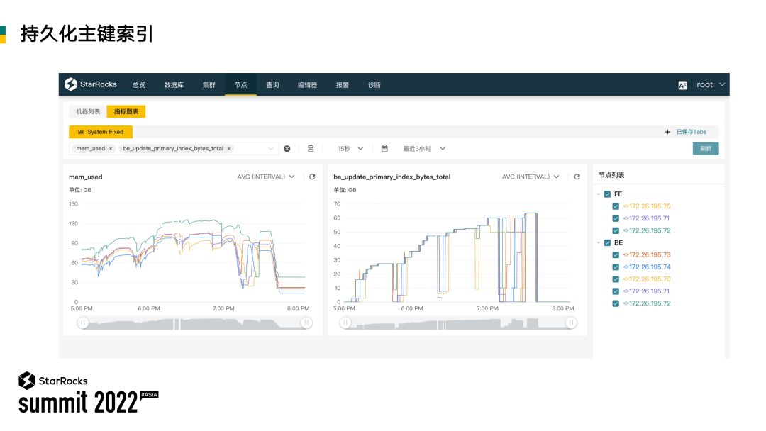 内存占用方面,相比原来的全内存,内存占用只有约原来的 1/10。下图是我们导入测试时的内存对比,左边是 BE 进程的内存总占用,右边是索引的内存总占用。在全内存索引模式下,可以看到随着数据的持续导入,总内存最高可以达到 120GB,索引内存最高达到 60GB。在开启持久化索引之后,随着数据的持续导入,总内存最高约 70-80GB,索引内存最高到 3-4GB,内存的使用下降是非常可观的。