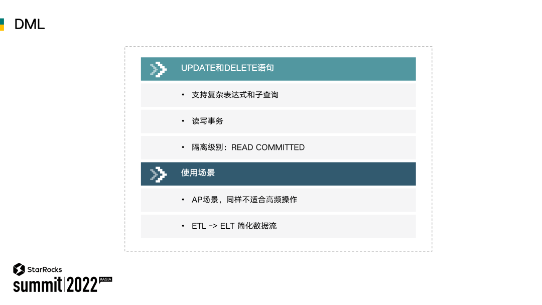 在事务层面,DML 本质上和纯写入事务的导入和纯读取事务的查询都不太相同。DML 是一个读写事务,在事务处理层面上,比导入和查询要复杂一些。目前 StarRocks 中导入和查询的事务隔离级别是最高的。主键模型引入 update 和 delete 语句之后,目前这两个语句隔离级别只能达到 read committed 的级别。在 AP 的大部分场景中可以基本满足需求。对事务隔离级别有强需求的一些应用,我们后期也计划提供支持,具体可能通过添加表锁的方式,但这种方式对事务的并发能力有一些影响。