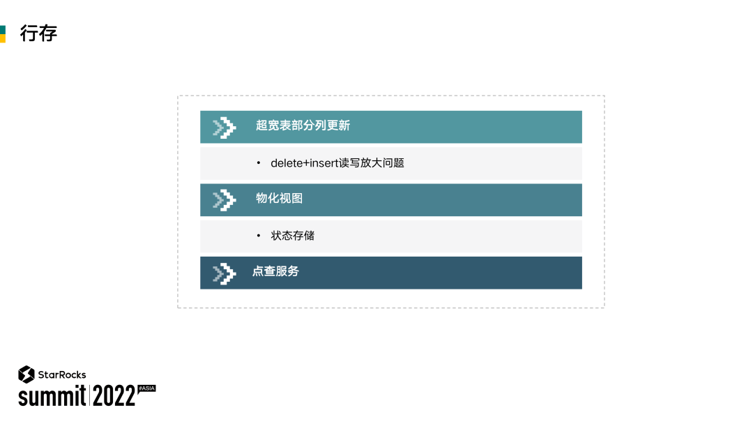 最后一个方向是存储引擎中行存的引入。前面介绍过的超宽表部分类更新带来的读写放大问题,可能通过行存可以部分解决读放大的问题。还有物化识图的 binlog 生成和状态维护,原有的列存,在底层原理上都是有先天不足的。而行存目前更适合这些需求。所以近期我们也在探索在存储引擎中引入行存,未来很可能是行列混存,并且是云原生基础上的架构。