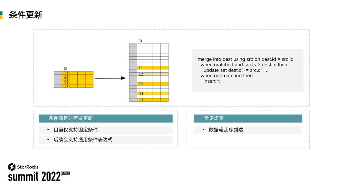 我们在导入时添加了条件的功能,只有条件被满足时才会进行这个更新。目前仅支持固定的条件。当导入的数据是乱序或者由于并发导入导致数据乱序,为了防止乱序导的数据把新的数据给覆盖掉,数据中一般会有一个时间戳字段代表该行的修改时间。这样在更新时可以指定一个条件,当这个时间戳大于当前时间时才进行这个更新操作,否则就忽略该更新行。假设导入的时记录是 src,要覆盖的目的是 dest。上面提到条件可以用src.ts > dest.ts 来表示。当前仅实现了这一种条件表达式,但后面我们会添加更加通用的表达式支持,让它变成更加通用的条件更新。