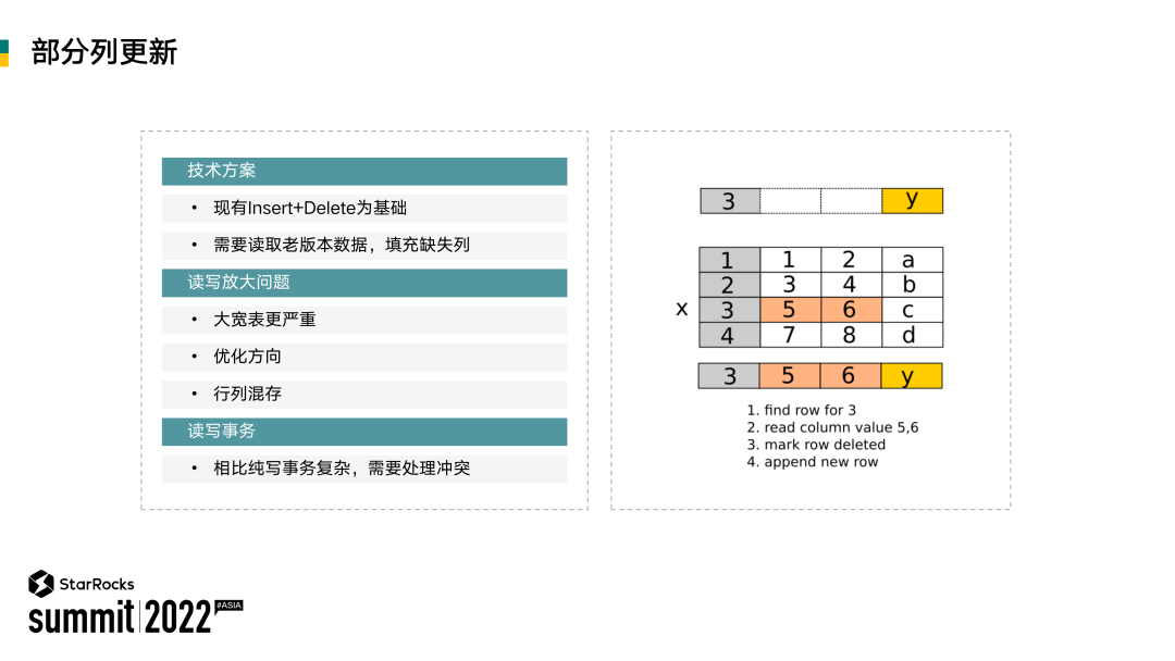 采用 Delete + Insert 的方式来实现部分列更新会带来一个非常严重的局限,即读写放大问题。特别是在大宽表场景下,仅更新很少一部分列的情况。比如一个表有 1000 列,只更新其中的1列,需要先读取其余的 900 多列,然后再写入全部的 1000 列,相当于读写各放大了 1000 倍。特别是读取阶段,由于是列存,所有的列都是分开存储的,意味着会带来非常多的随机 IO。所以目前推荐部分列更新仅仅在一些列不是特别多的场景下使用,比说小于 500 列的情况下,并且尽量在 SSD 磁盘上使用这个功能。随着列数的增加,我们写入的性能会逐渐衰减。为了部分解决这个问题,目前规划中的解决方案是引入行存,这样能够解决一部分读放大的问题,但是写放大的问题依旧没有解决。要解决这个问题,估计需要在存储引擎上有重大的架构重构。