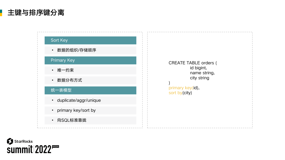目前 StarRocks 各种的表模型,包括 suplicate key、aggregate key、uniq key 都是标准 SQL 表模型的几种特殊表现形式。统一到一种语法表达之后,对用户来说,我们整个系统只有一种表,其概念和数据模型是和标准的数据库模型是非常类似的,这样是最容易理解的,并且可以进一步提升整个 StarRocks 的易用性。