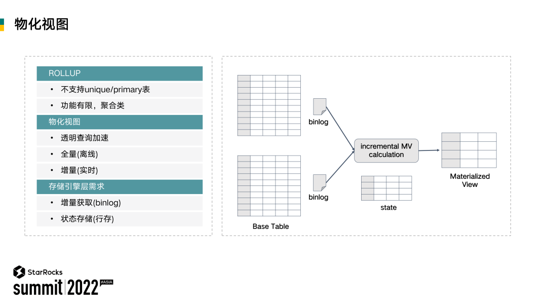 我们主要关注的就是物化视图对存储引擎层面的一些新需求。一是增量物化视图的构建需要能够提供表的一个增量修改数据。那么我们认为它是一种类似 binlog 的概念,对表的所有写操作都要生成一份日志,里面记录了哪些行被删除掉,哪些行被添加,类似 MySQL 中的 binlog。另外一个是维护物化视图的算子,通常是需要一个状态存储的,并且这个状态存储是需要可持久化的,那也需要存储引擎提供状态存储的支持。其他的查询加速对存储运行也会有新的需求。
