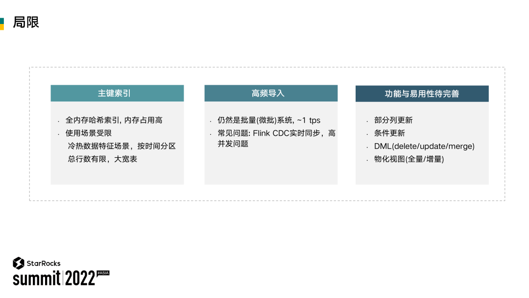 最后一个问题是功能性和易用性是待完善的。首先是对部分列更新和条件更新的支持。目前 ETL 数据流强依赖这种导入方式。然后是相关的 DML 需要补足,比如 delete、update、merge 语句的缺失,这些语句对从 ETL 到 ERT 的衍进是非常重要的。最后是主键模型和 uniq 模型类似,还不支持创建更通用的物化视图。由于数据会发生更新变化,无法及时维护,相比没有更新的 duplicate 和聚合表来说,实现它的资源消耗会多很多,困难也会多很多,当然这也是 StarRocks 实现不可能的一个机遇。