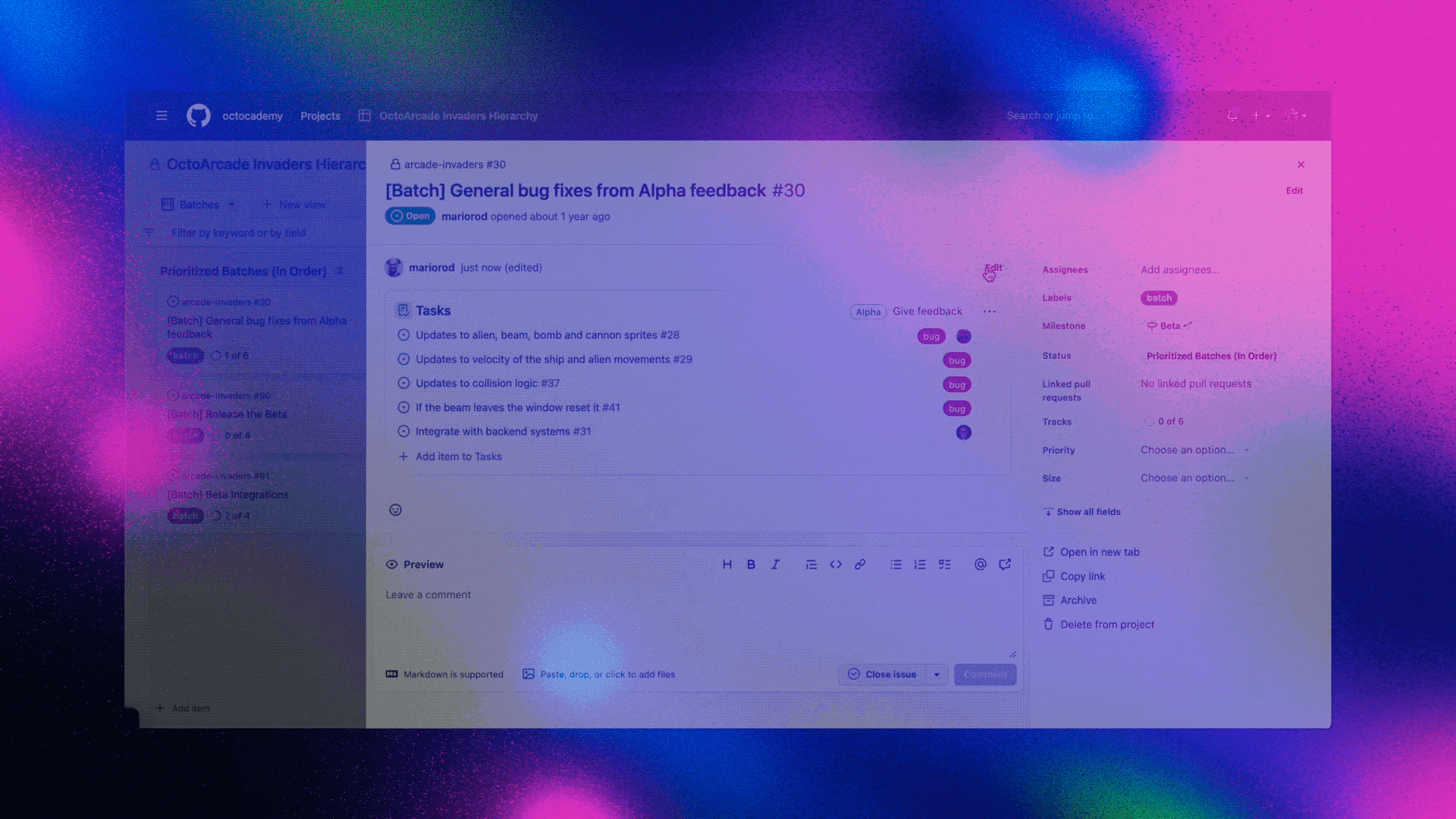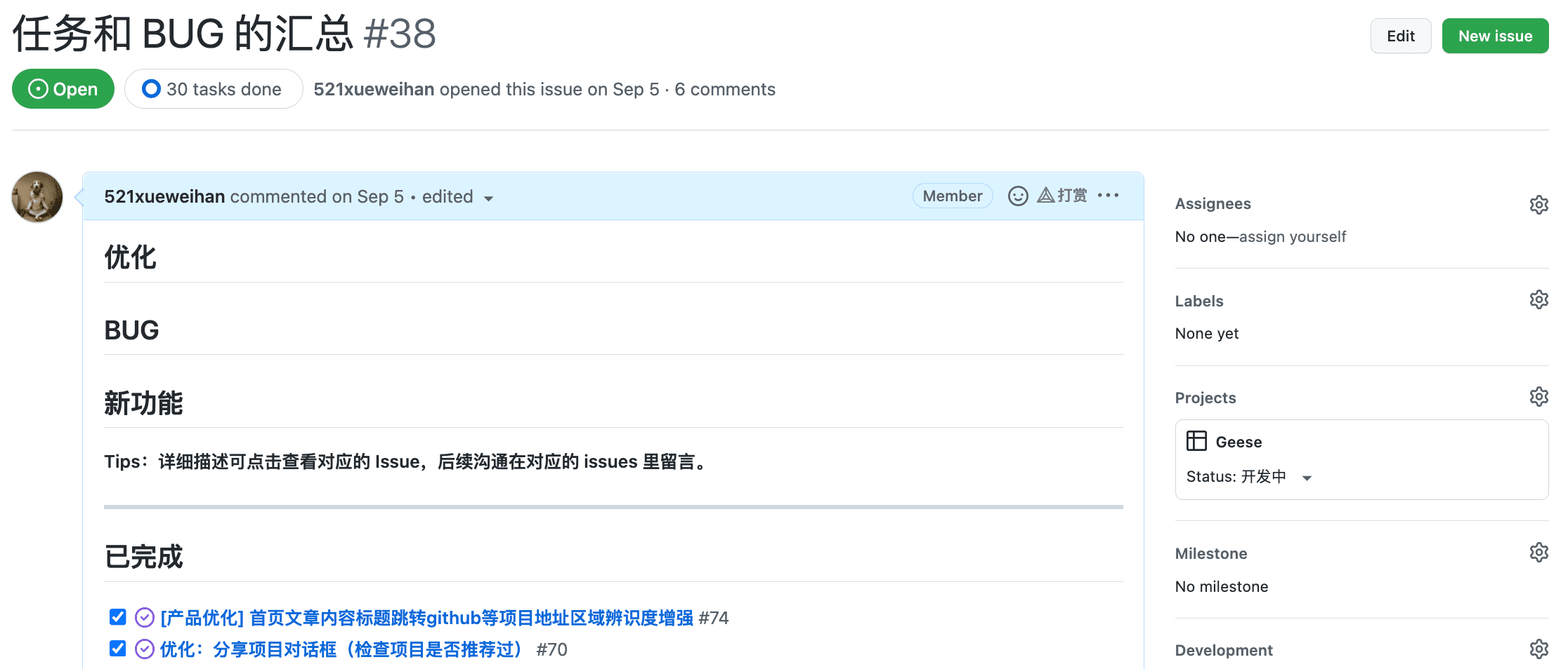 GitHub issues 作为 Projects 的重要一部分,它目前已支持 Markdown 的 task 语法,然后 task 可以是关联 Issues 或者 Project view,实现了状态的变化实时+双向同步。