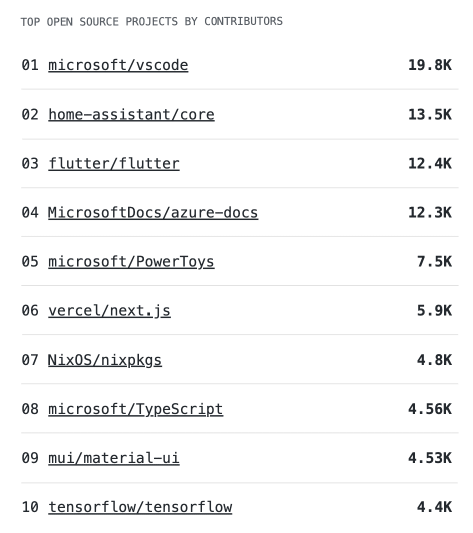 - 贡献者最多的开源项目,前三名分别是:microsoft/vscode、home-assistant/core、flutter/flutter。