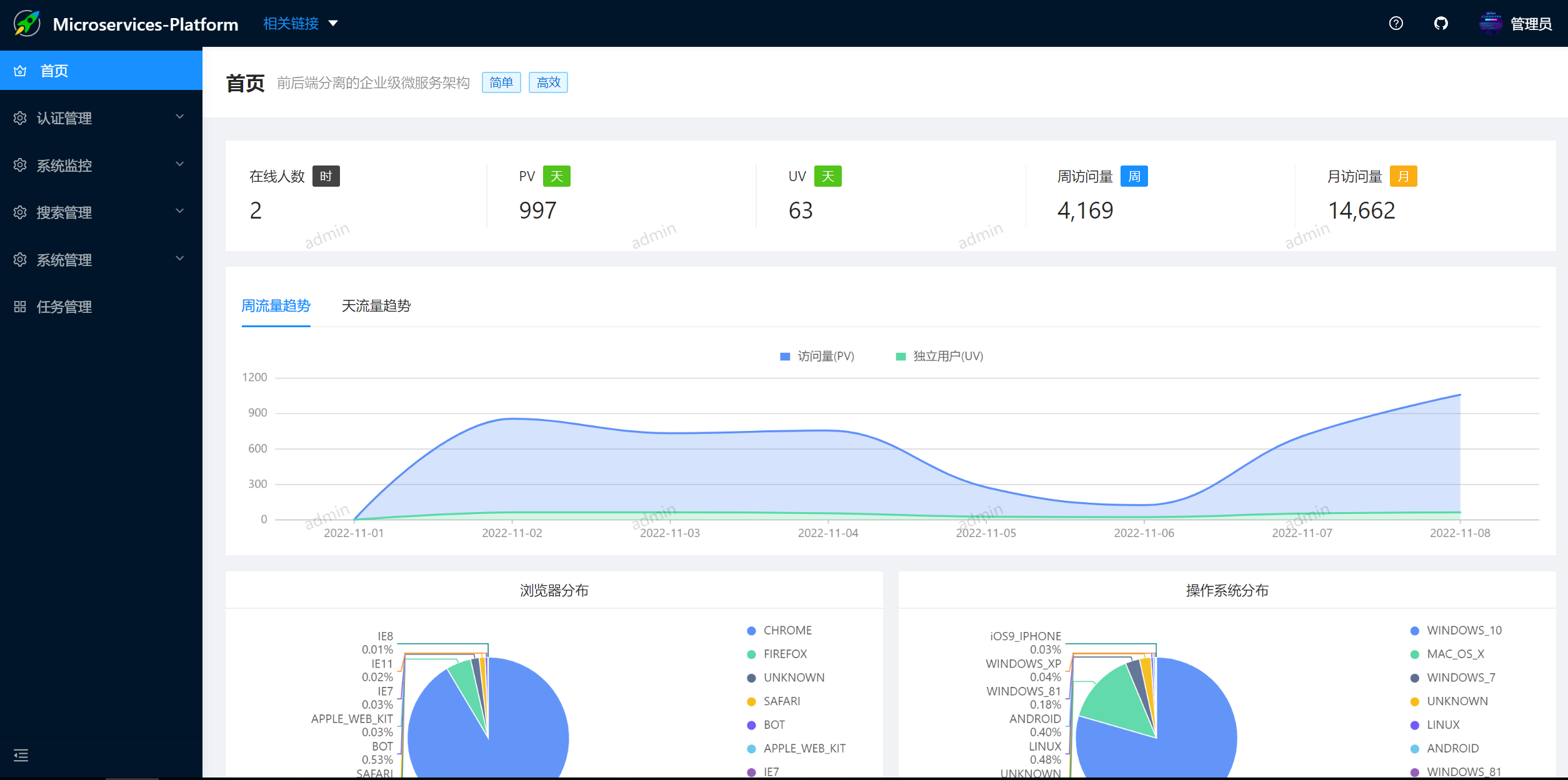 采用 Ant Design Pro 框架,基于 UmiJS v3.x 和 ProComponents 图表采用 Ant Design Charts