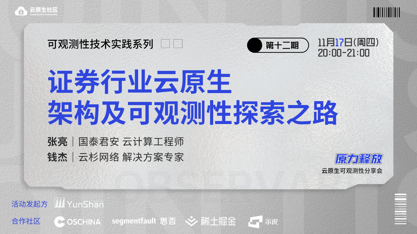 直播活动由云原生社区区主办,云杉网络发起,本期聚焦 “证券行业云原生架构及可观测性探索之路” 主题,与听众一起探讨证券行业可观测性运维保障体系的落地实践、可观测性体系建设的技术发展,以及全面、高效、智能的可观测性解决方案。