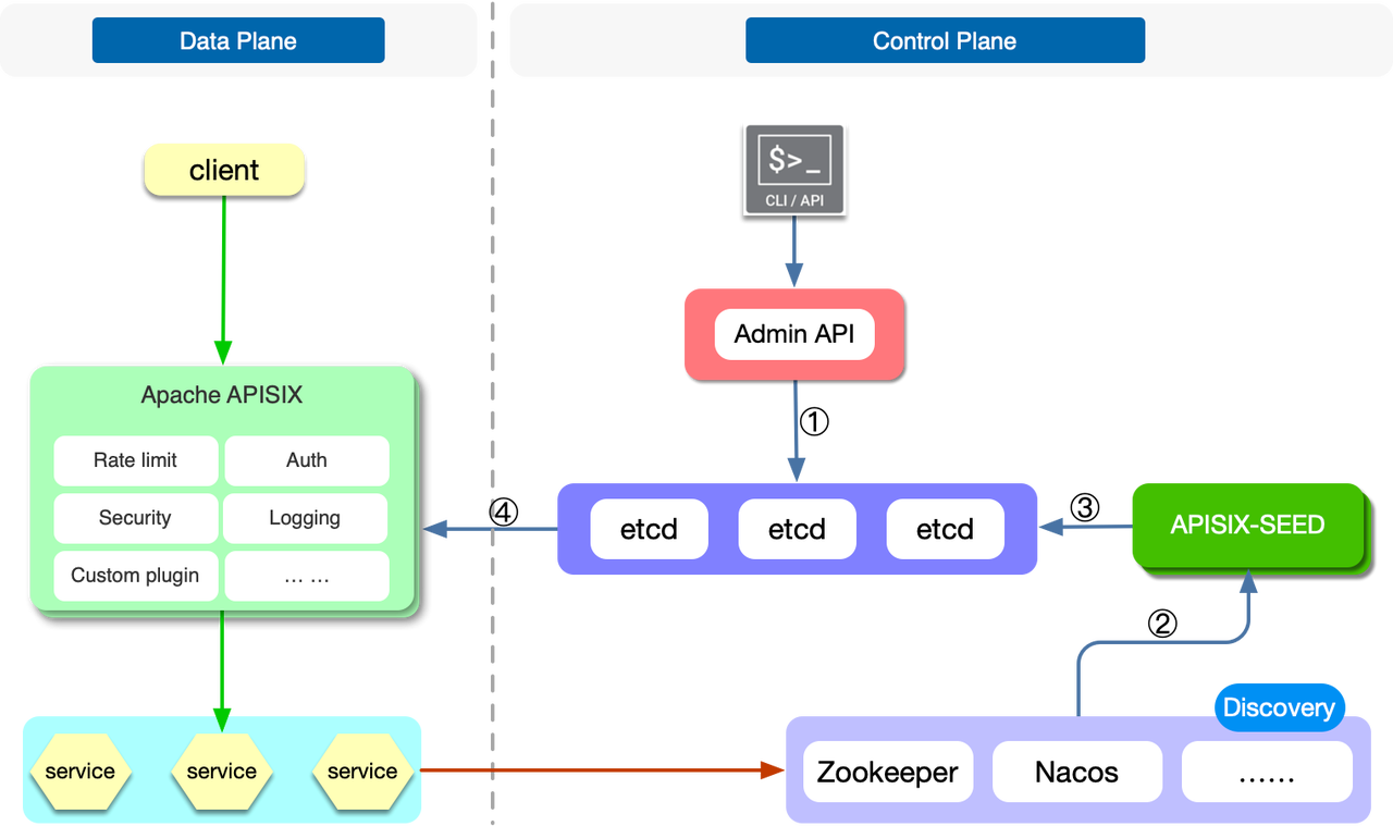 APISIX 在现版本中,已支持集成了很多服务发现组件,比如 Zookeeper、Consul、Nacos 等。但目前这些集成都是在数据面上完成的,一旦你的数据面节点非常多,这对于后续的服务发现组件压力也是非常大的。