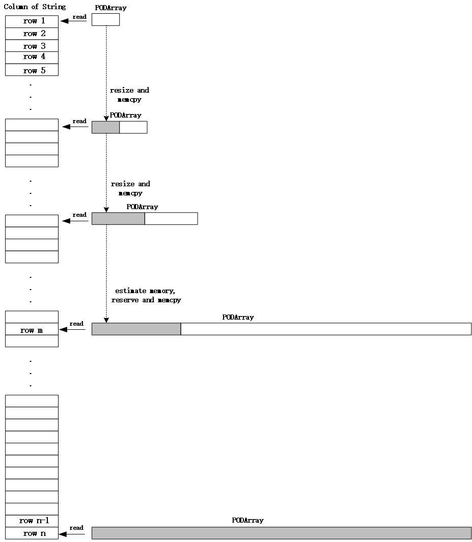 当然,该方法只是对所需的内存进行了预估,根据预估的大小提前申请了内存,减少了后面逐行读取字符串时大量的 Resize 操作,减少了内存申请和内存拷贝的次数,并不能完全消除字符串读取过程中的内存拷贝。该优化方案只对一列中字符串长度比较均匀的情况有效,内存的预估相对会比较接近实际内存。如果一列中字符串长度差别较大,该方法的效果可能不甚明显,甚至可能会造成内存浪费。