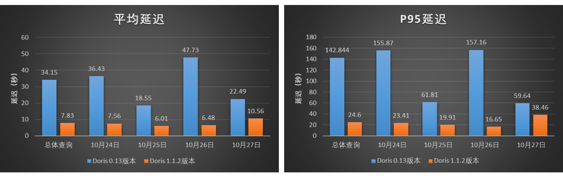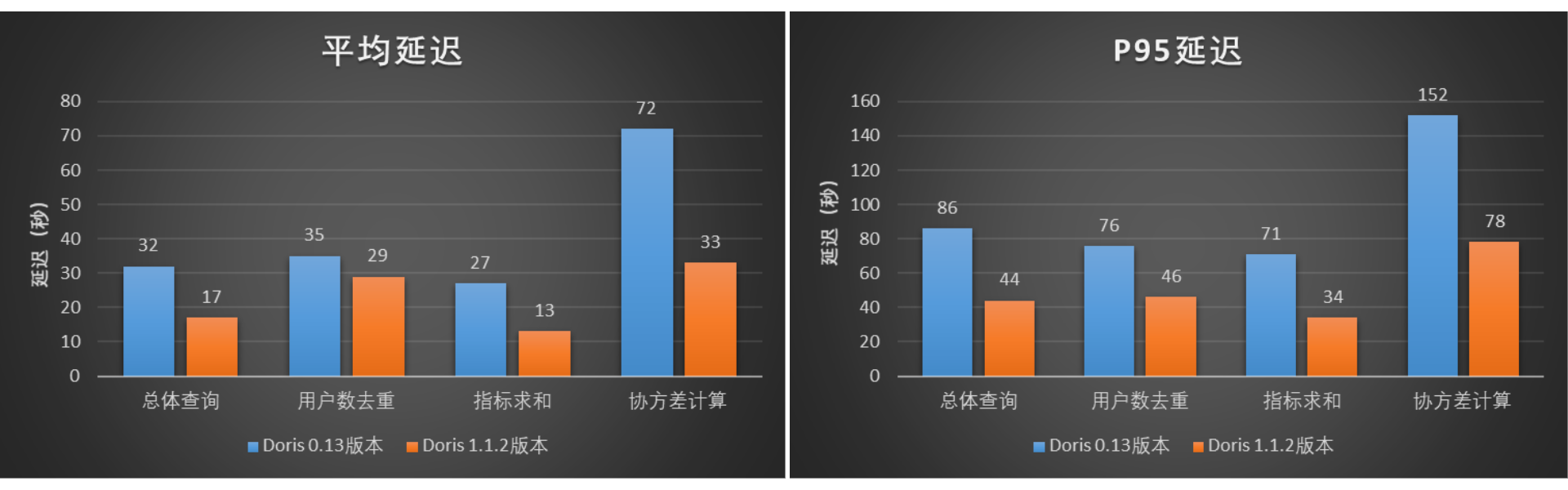 我们选择了 A/B 实验场景中一批典型的用户去重、指标求和以及协方差计算的查询 Case(SQL 总数量为 3245)对两个版本进行并发查询测试,测试表的单日分区数据大约为 31 亿(数据量大约 2 TB),查询的数据范围会覆盖最近一周的分区。测试结果如图所示,Doris 1.1.2 版本相比 Doris0.13版本,总体的平均延迟降低了大约 48%,P95 延迟降低了大约 49%。在该测试中,Doris 1.1.2 版本相比 Doris0.13 版本的查询性能提升了接近 1 倍。