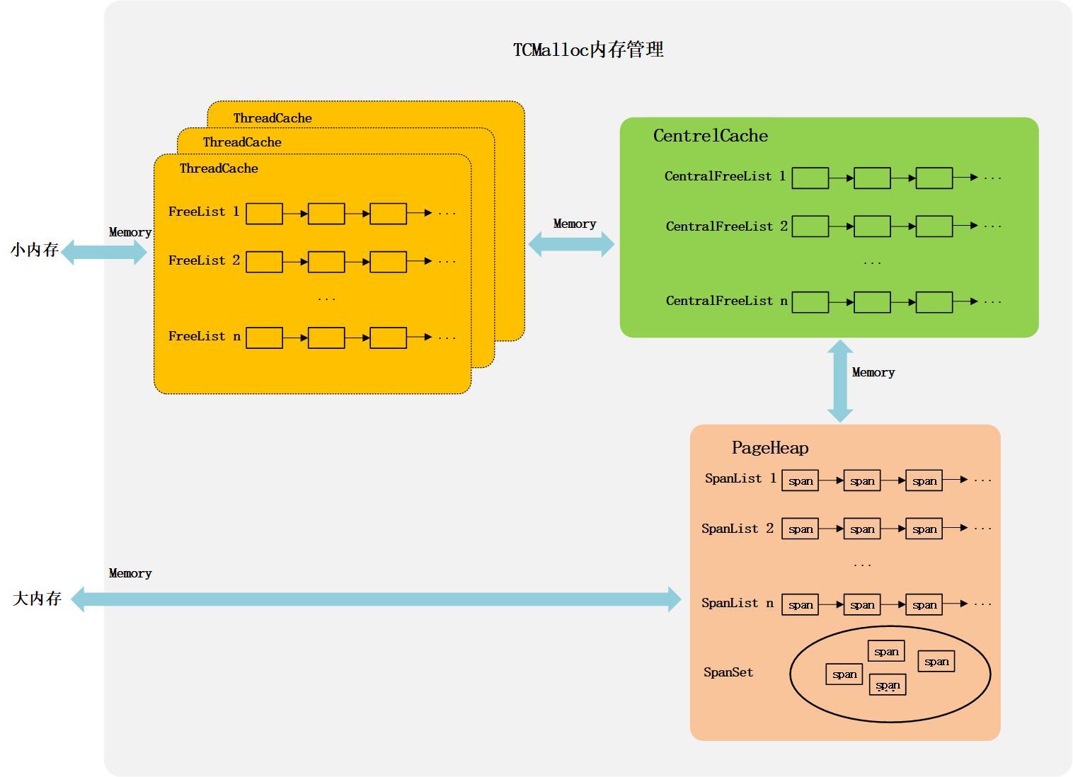 大内存的分配和释放直接通过 PageHeap 来实现,分配的内存可能来自 PageHeap 的缓存,也可能来自 PageHeap 向系统申请的新内存。PageHeap 向系统申请或释放内存时需要加锁。