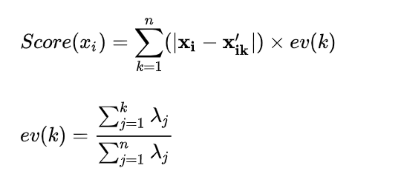 对于数据样本X_i, 假设其基于 k 维特征向量重构的样本为X_ik^' , 则该数据样本的异常得分可以用如下的公式计算: