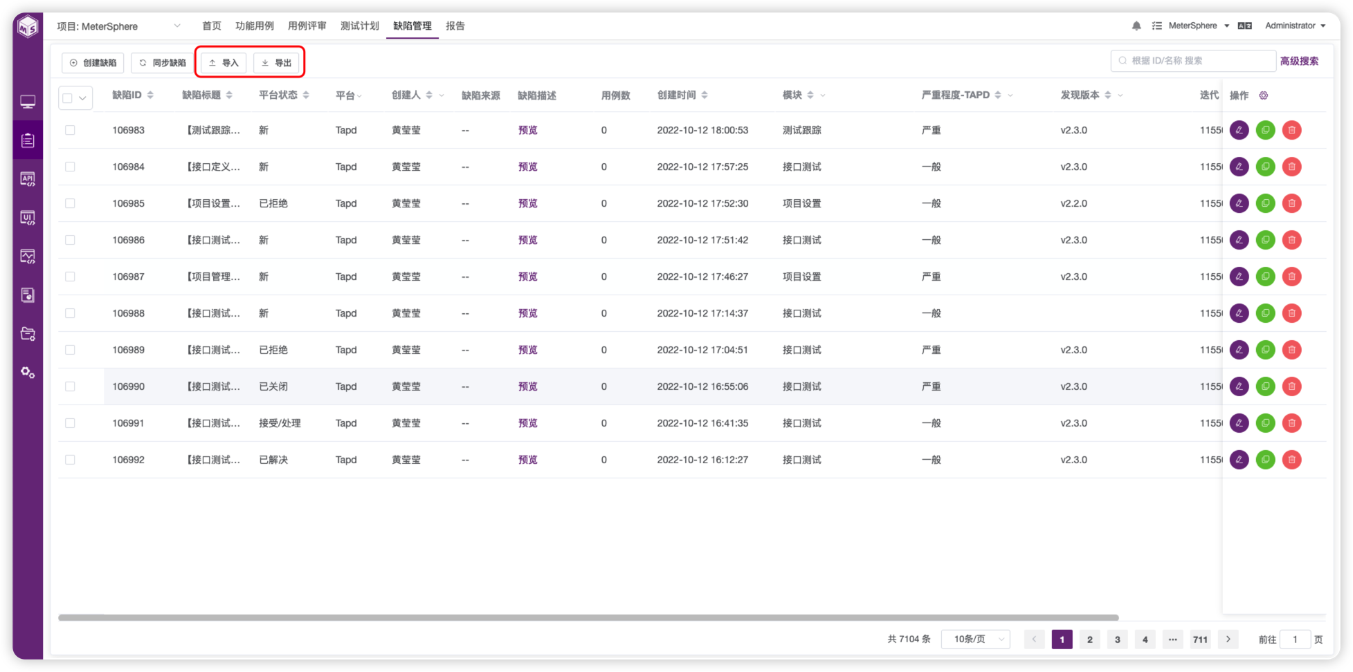 在MeterSphere v2.4.0版本中,缺陷管理新增了导入/导出功能。其中,导入提供标准模板,导出支持自定义导出字段,方便用户灵活地将缺陷导出到本地进行编辑和管理。