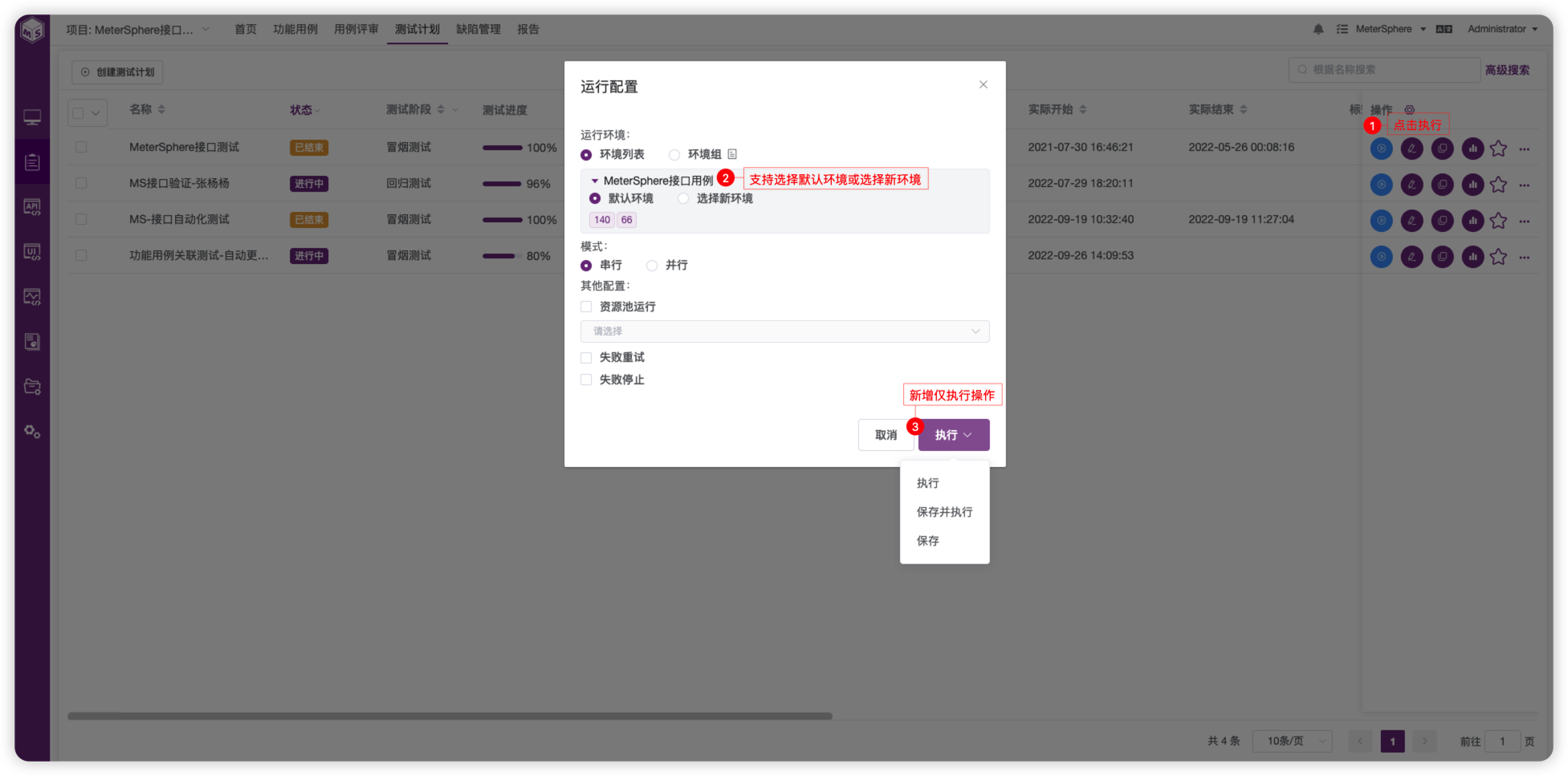 在MeterSphere v2.4.0版本中,测试计划执行支持区分环境执行。没有选择新环境时统一按默认环境执行,以覆盖DevOps流水线场景。同时增加“执行”操作,当用户选择了新环境执行时仅对当次运行生效,不会变更测试计划的默认运行环境,全面覆盖了一个测试计划同时在多个环境执行的需求。