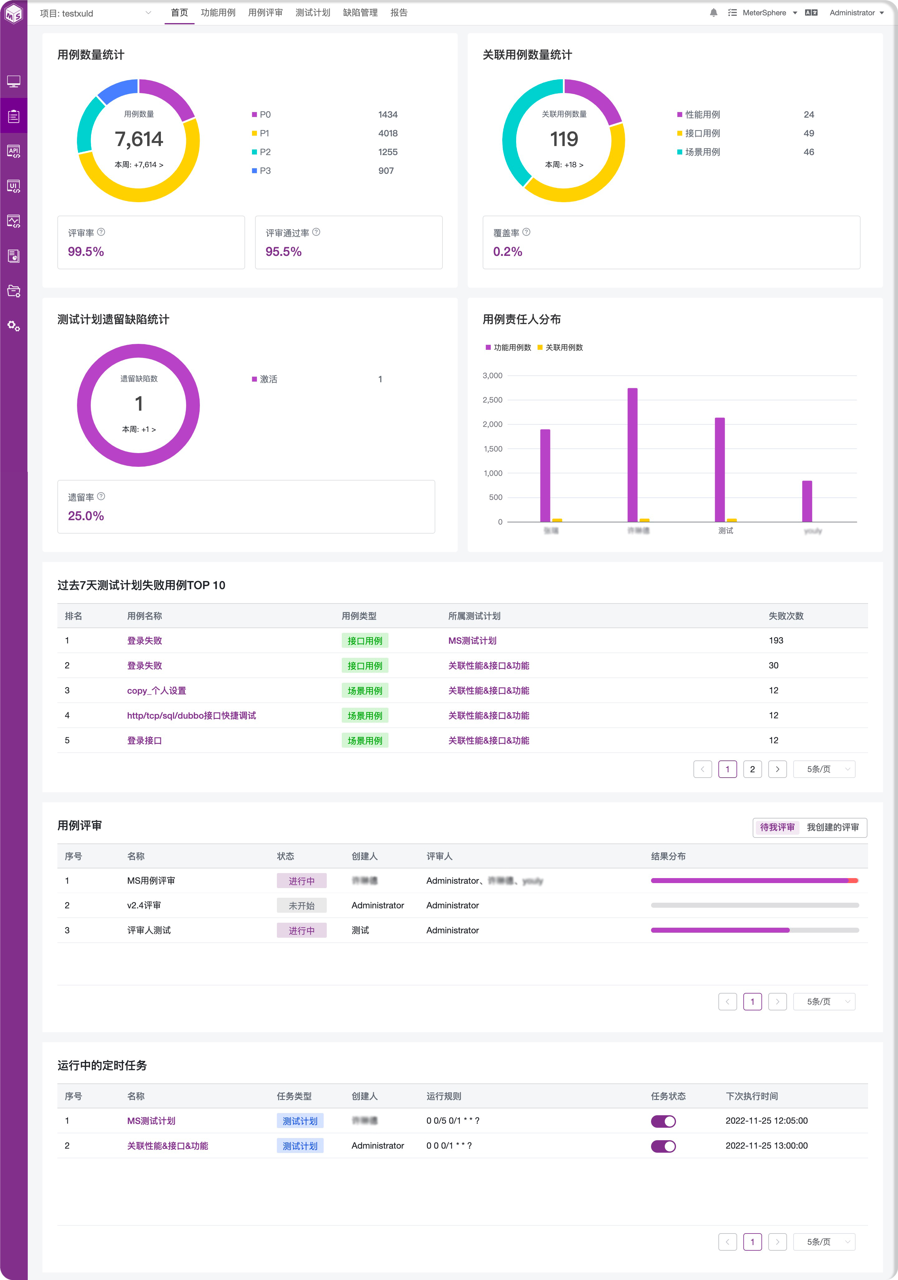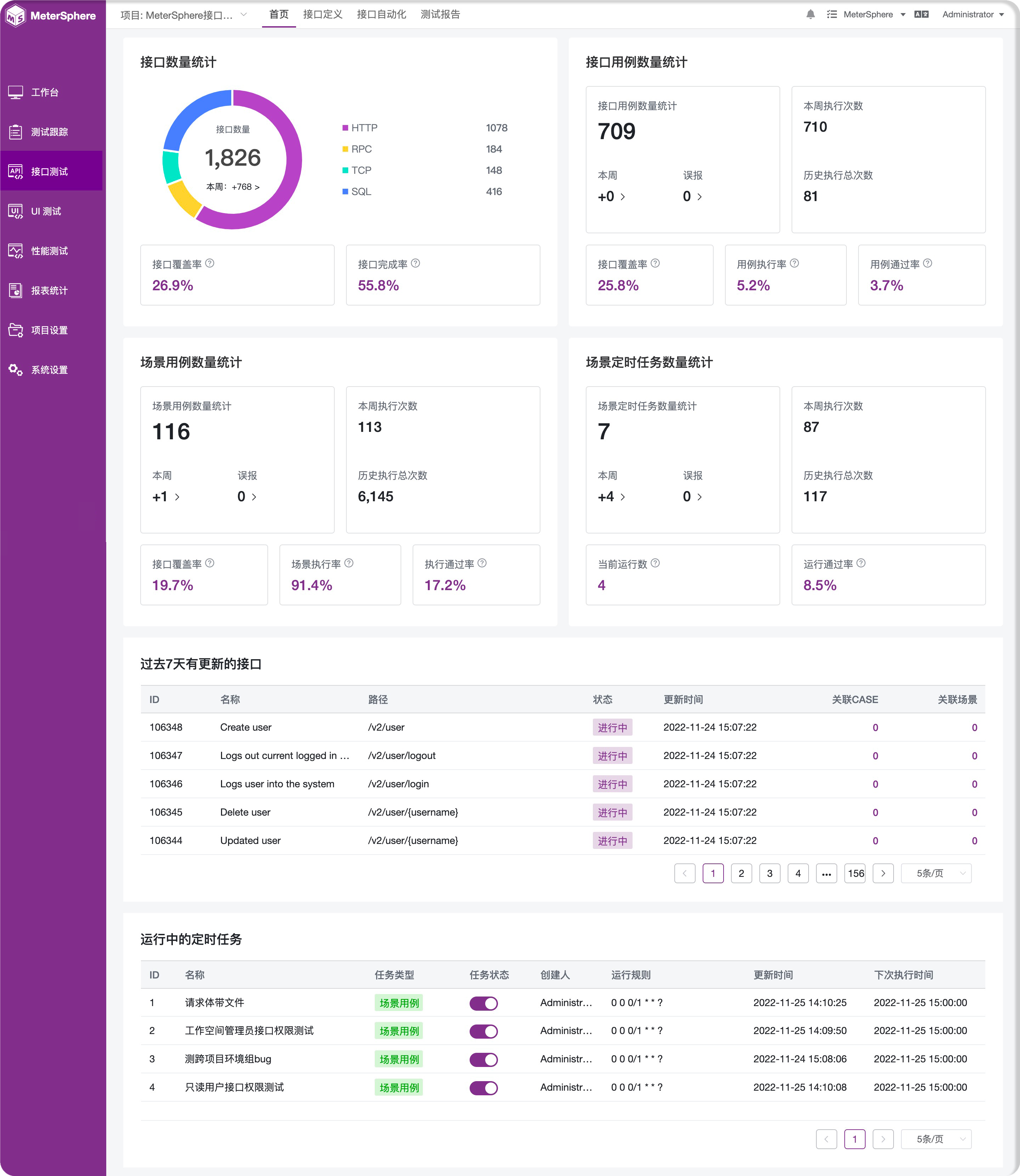 接口测试首页:将核心指标与明细指标分层展示,视觉上避免了因数据过多所导致的视觉疲劳。同时针对接口用例和场景用例新增了执行率的统计,用户可以进一步分析当前项目中用例的执行情况。