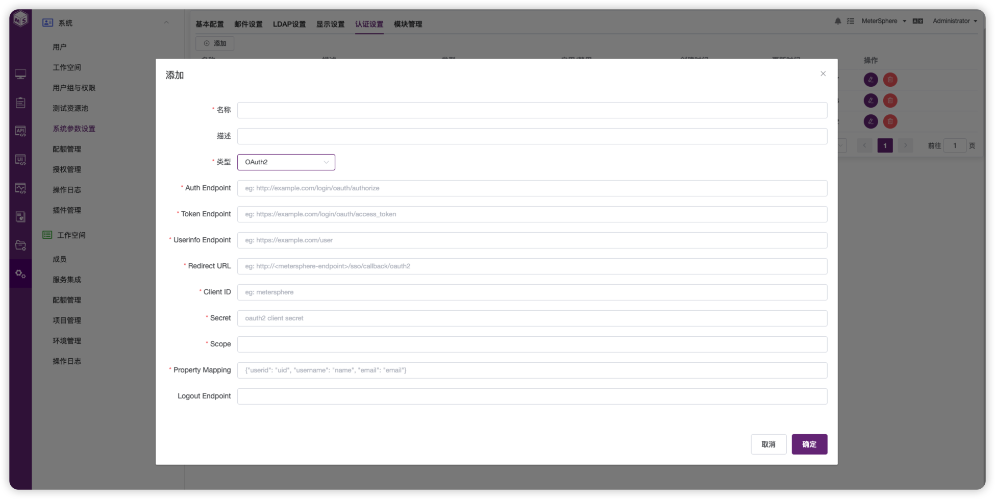 在MeterSphere v2.4.0版本中,单点登录系统认证新增支持OAuth 2.0协议。选择“系统”→“系统参数设置”,添加OAuth 2.0类型配置的相关信息后,即可在登录页面选择通过OAuth 2.0协议认证来登录系统。