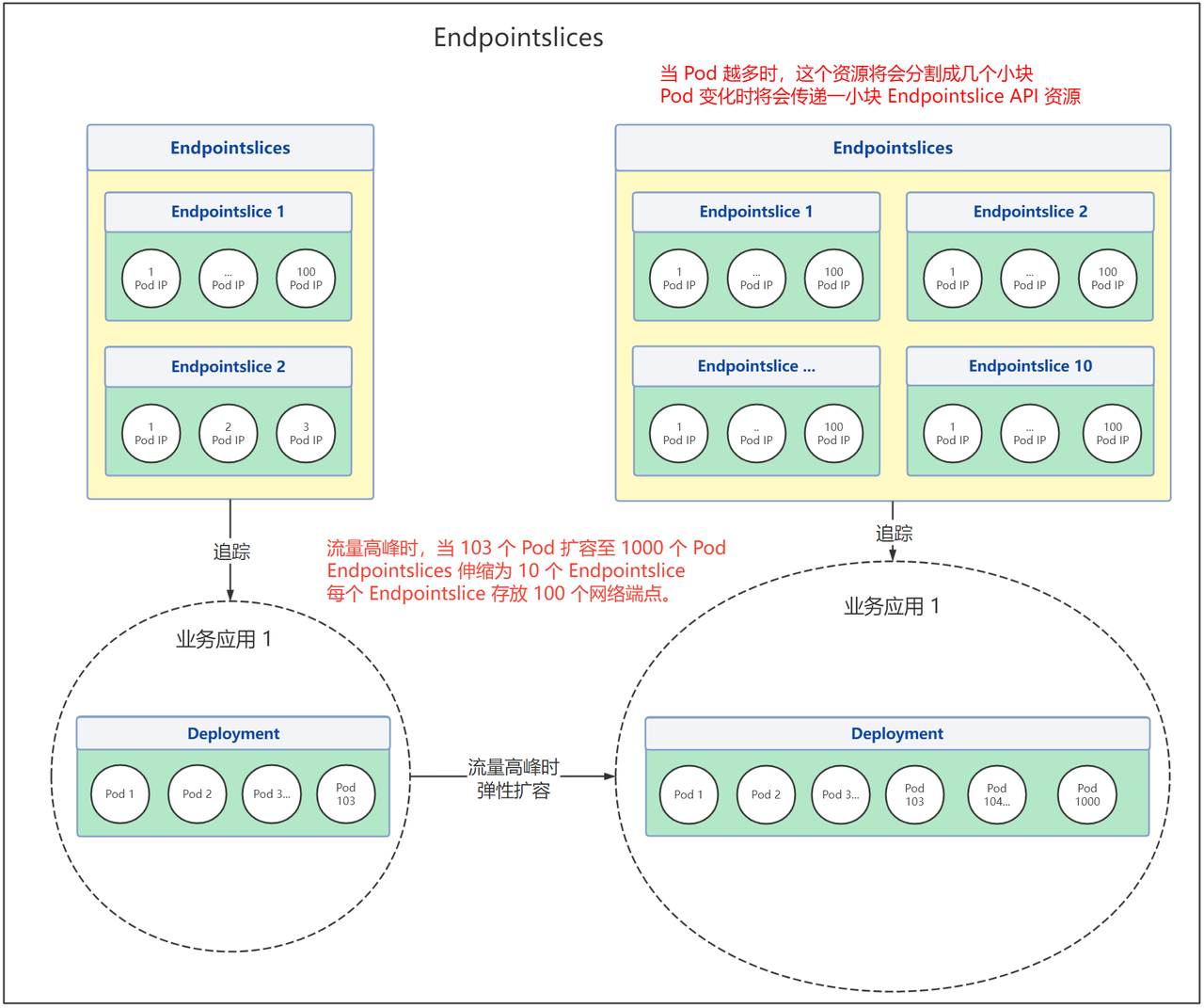 - 一个 Service 只有一个 Endpoints 资源,这意味着它需要为支持相应服务的每个 Pod 存储 IP 等网络信息。这导致 Endpoints 资源变的十分巨大,其中一个端点发生了变更,将会导致整个 Endpoints 资源更新。当业务需要进行频繁端点更新时,一个巨大的 API 资源被相互传递,而这会影响到 Kubernetes 组件的性能,并且会产生大量的网络流量和额外的处理。