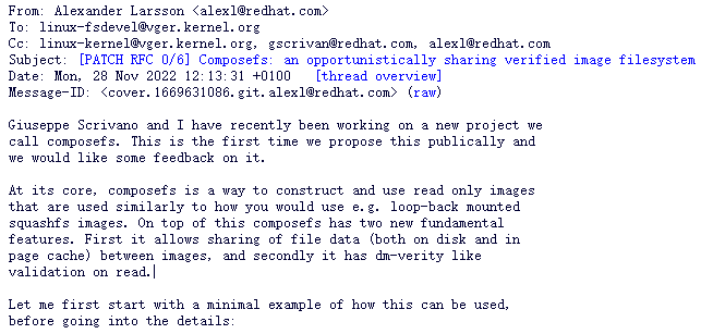 红帽工程师 Alexander Larsso 与 Giuseppe Scrivano 宣布开发一个新的Linux 内核文件系统 “Composefs” ,Composefs是一个新的机会共享(opportunistically-sharing)和可验证的只读文件系统。