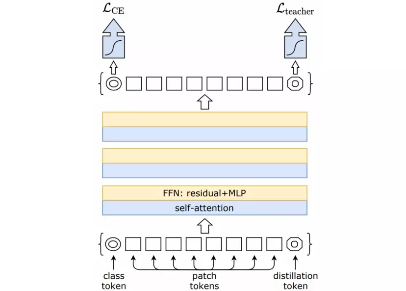 Touvron等人还使用一种专门针对Transformer模型的蒸馏(distillation)技术进一步改进ViT模型。将一个性能强大,但可能庞大而难以训练的teacher模型“蒸馏”为一个基于Transformer架构的student模型,做法和Hinton等人提出的”知识蒸馏“相似( Hinton et al. 2014 )。这种模型称为DeiT模型(Data-Efficient Image Transformer)。