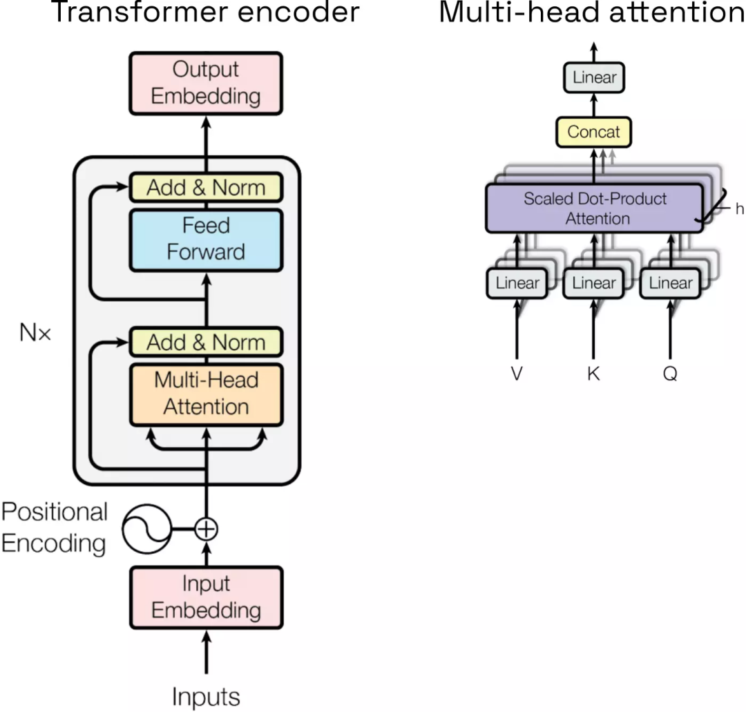下图是Transformer架构的总览,图左展示了Transformer编码器。自注意力机制是Transformer架构的关键。自注意力层中的所有中间token表示会通过计算成对相似性(pairwise similarities)进行互动,这些成对相似性会成为上一层相应token表示的权重。