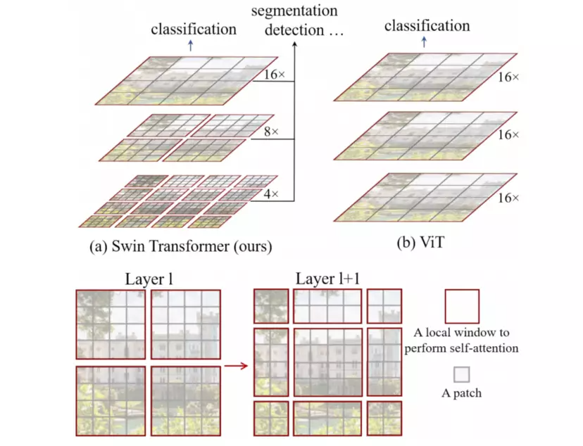 为了解决ViT模型中图像块边缘空间信息部分丢失和计算复杂度二次方增长的问题,Liu等人引入了一种基于分层特征图和移位窗口(shifted window, Swin)的ViT模型( Liu et al. 2021 )。Swin Transformer有两个核心贡献,如图7所示。
