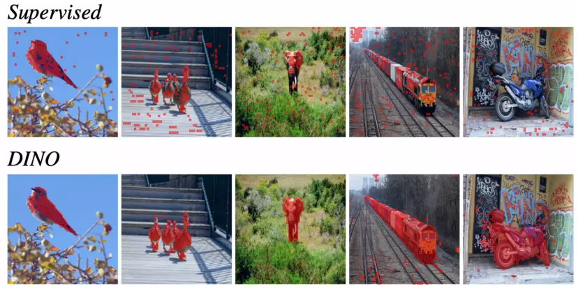 还有其他工程方法可以避免模型坍塌,这些方法的核心概念都是使student模型预测出一个与teacher模型的预测结果相似的图像表示——teacher模型处理的输入图像与student模型的略有不同——这样可以提升从局部到全局的关联性。用ImageNet图像和自蒸馏方法训练DINO(不使用标签),结果发现DINO可以在无监督的情况下为同一标签下的图像生成相似的表示。DINO通过简单的KNN分类器和潜在图像表征就在无监督ImageNet图像分类任务上取得了出色表现。