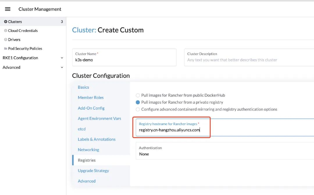 同样,可以在 Rancher Manager 修改创建 K3s 集群的参数来完成使用国内资源安装 K3s 集群。只需要在创建 K3s 集群时导航到 Registries,选择 Pull images for Rancher from a private registry 并设置 Registry hostname for Rancher images 的值为阿里云镜像仓库的地址 "registry.cn-hangzhou.aliyuncs.com" 即可,如下图: