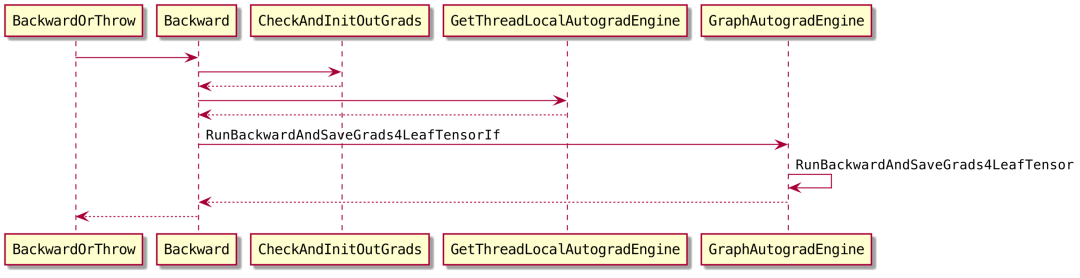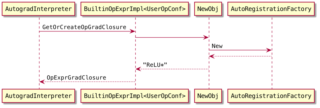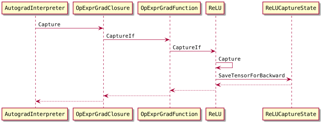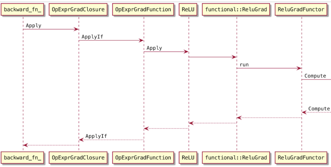 OpExprGradClosure只是简单的把ReLU存下来供backward执行时调用。 整个调用流程如下: