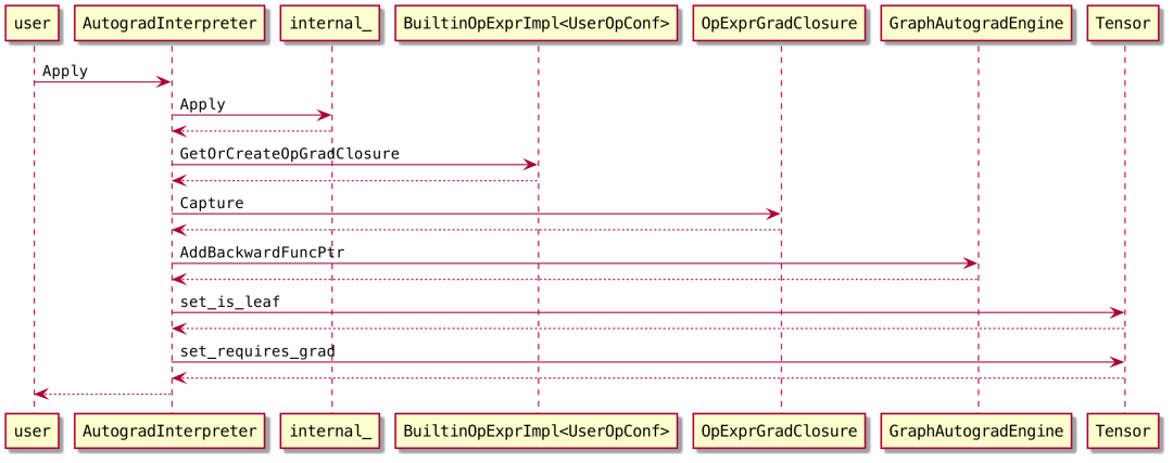 以下只考虑前述示例的root节点的执行。也就是y对应的FunctionNode。对于y来说,backward_fn就是AutogradInterpreter::Apply中定义的lambda表达式( https://github.com/Oneflow-Inc/oneflow/blob/48e511e40e09551408c96722c09bd061ce320687/oneflow/core/framework/op_interpreter/op_interpreter.cpp#L103-L110 )。