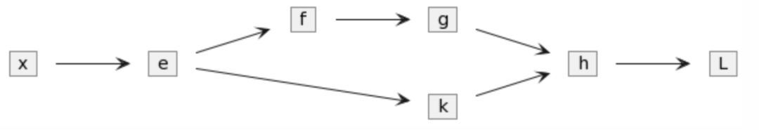 对于节点h来说,它需要把梯度传给g和k。 对节点e来说,它需要对f和k传来的梯度求和,才是∂L/∂e。 这样,L对x的梯度,仍可以按链路拆解,一条链路前后节点间的梯度是乘积关系,传入的多条链路梯度是加和关系。