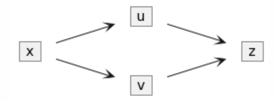 根据这个公式可以知道,z对x的梯度分别沿两条链路传播,z -> u -> x和z -> v -> x,节点x将两个梯度之和作为z对x的梯度。