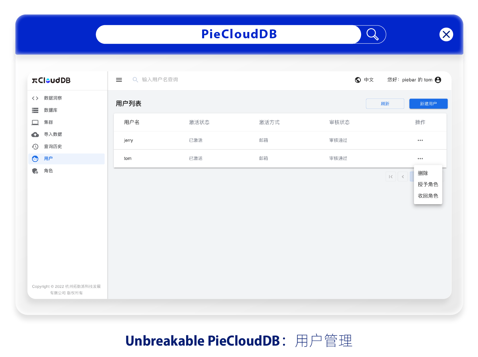 PieCloudDB 实现了多租户下的用户管理功能,支持创建用户、查找用户、修改用户信息、重置密码、赋予用户角色、删除用户等操作;可视化的管理界面让用户管理变得更加便捷。