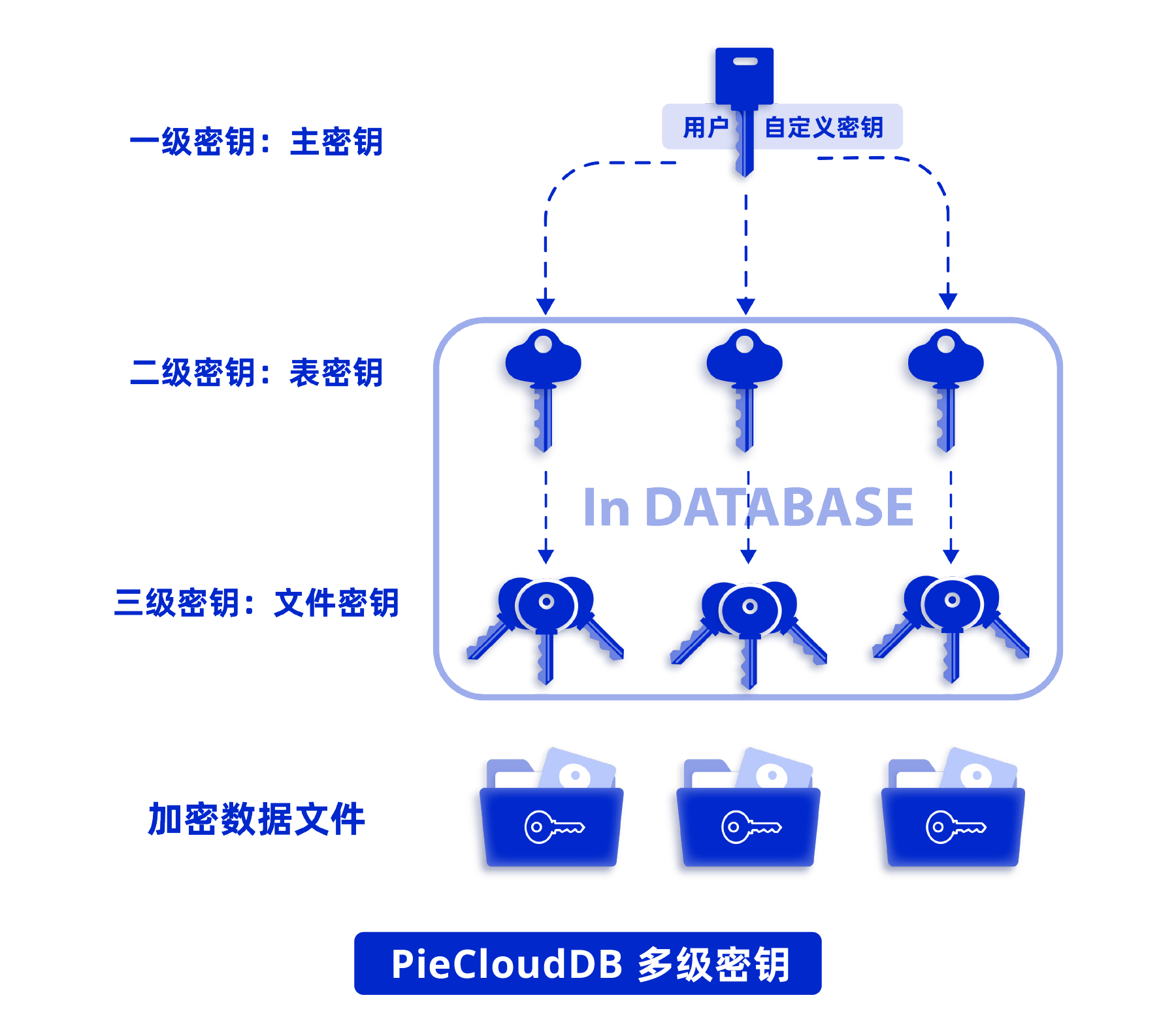 PieCloudDB使用三层密钥结构,第一级密钥为主密钥,用来加解密第二级密钥,第二级密钥为各个数据表的表密钥,用来加解密第三层密钥,第三级密钥为各个数据文件的密钥,用来加解密对应的数据文件。 PieCloudDB 内每个租户数据完全隔离,拥有独立的密钥体系。三层密钥有效防范了数据泄露,确保了用户的数据安全。