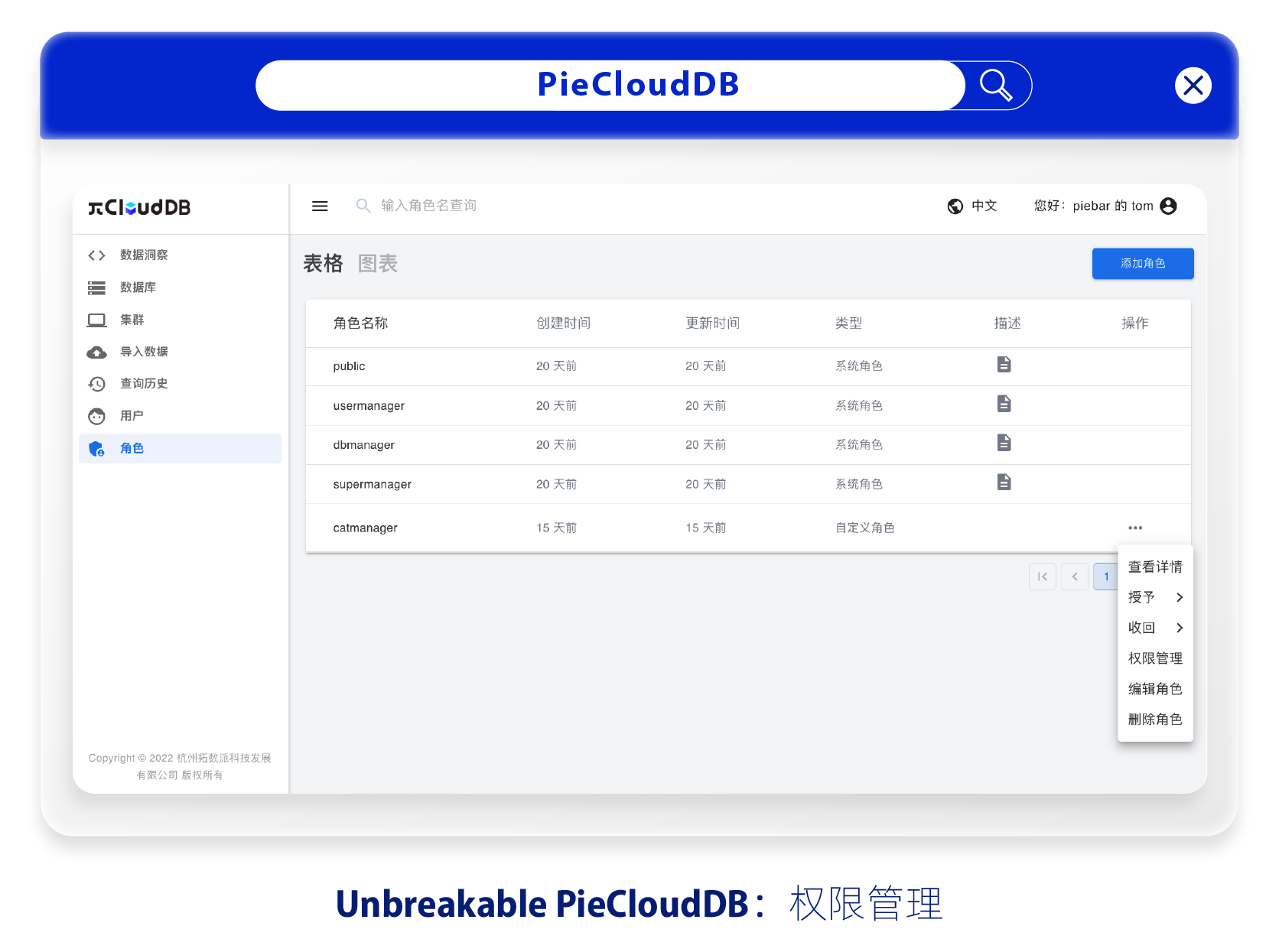 PieCloudDB 为用户提供了智能可视化的云原生平台。通过可视化的操作为用户在角色与权限管理操作上降低了门槛,让数据库管理员能够轻松管理不同角色可见的数据,让数据库使用体验上了一个台阶。 PieCloudDB 基于 RBAC(Role-Based Access Control,基于角色的访问控制)模型设计权限,将用户通过角色与权限进行关联。在这种模型中,用户与角色之间,角色与权限之间,是一种多对多的关系。