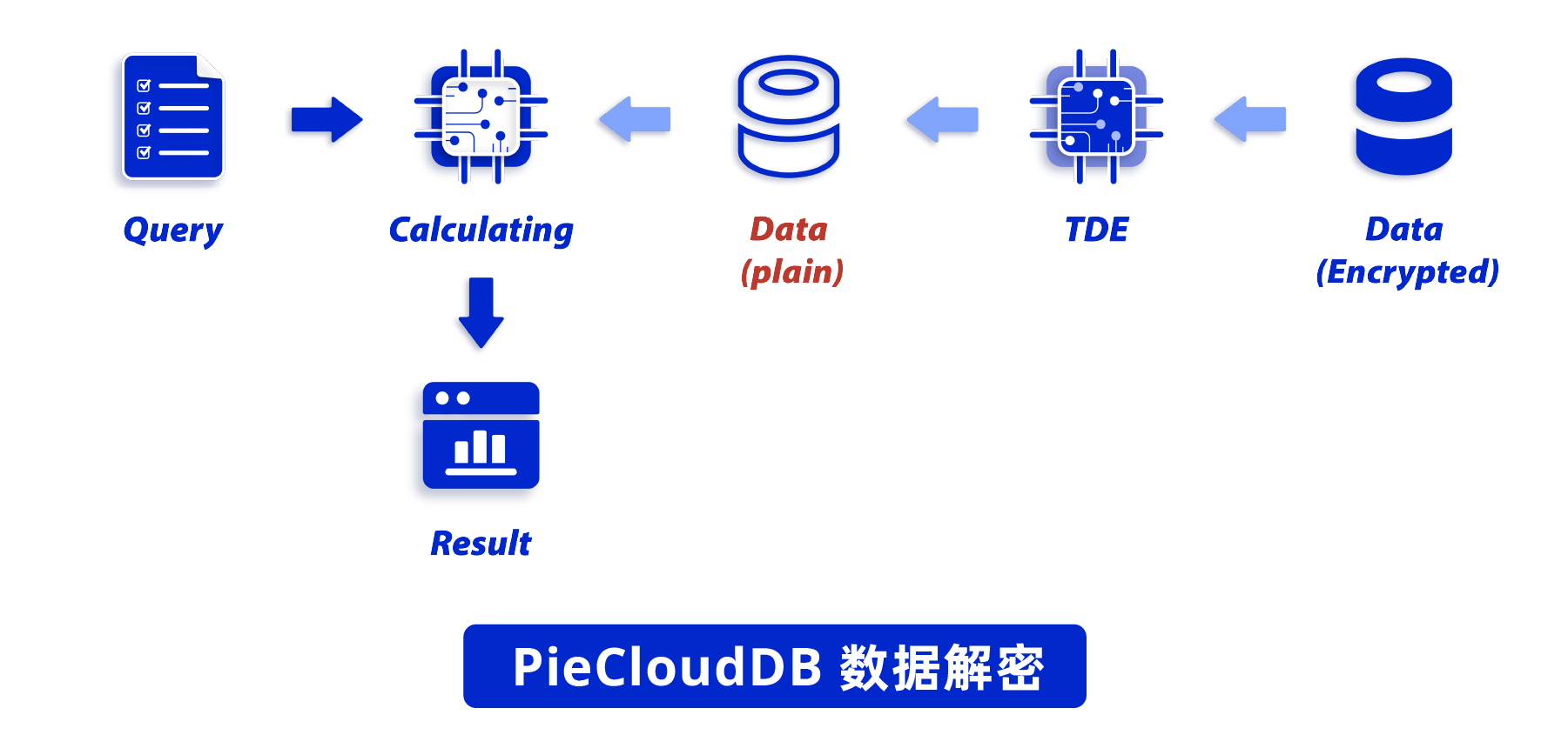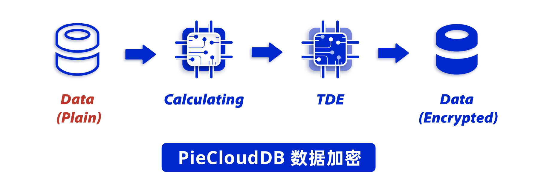 PieCloudDB 支持数据实时加密,即对数据文件执行实时I/O加密和解密,实现原生用户数据(包括表数据、辅助数据、磁盘缓存文件)的自动加解密,无需修改查询语句且性能损失小。